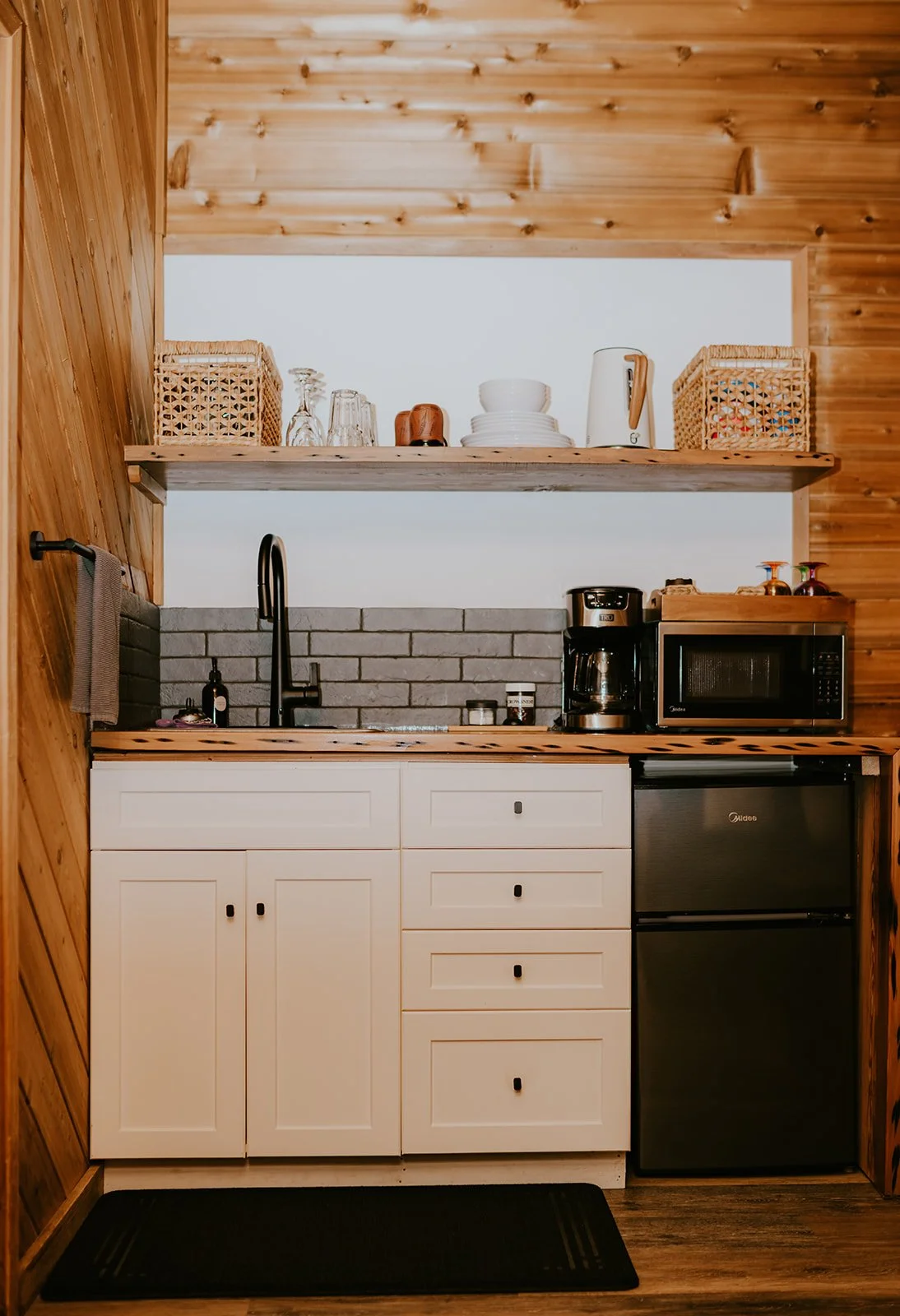 The larger of our two private cabins has one queen bed, a kitchenette, mini fridge, small dining area, living room, private bathroom and smart TV
