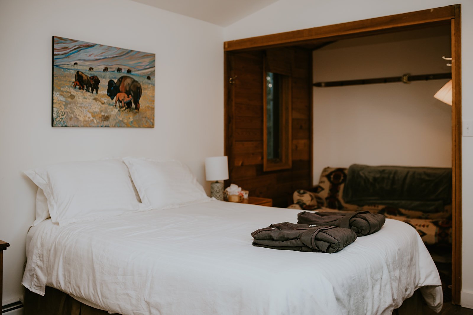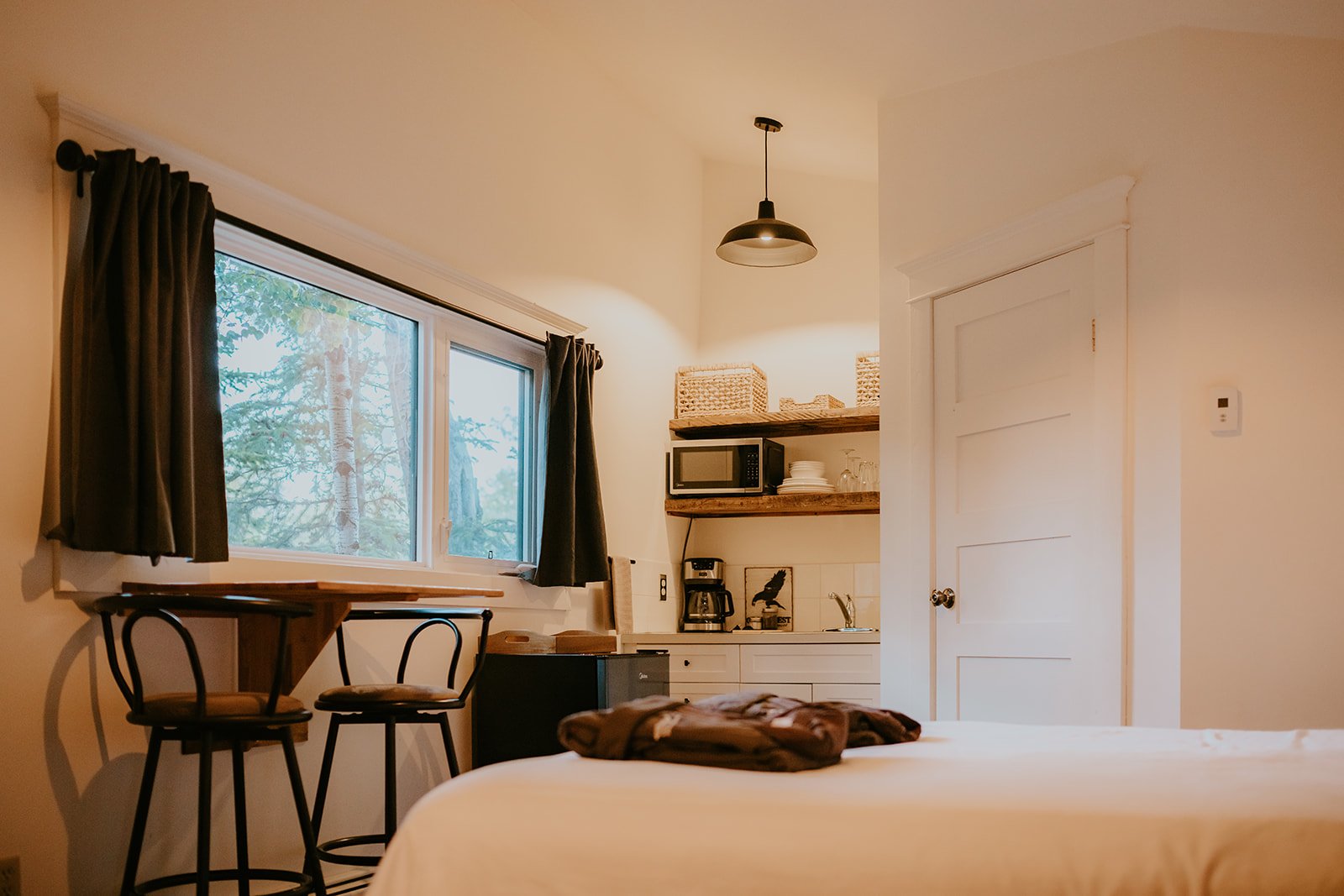 The smaller of our two private cabins has one queen bed, a kitchenette, mini fridge, small reading nook, private bathroom and smart TV.
